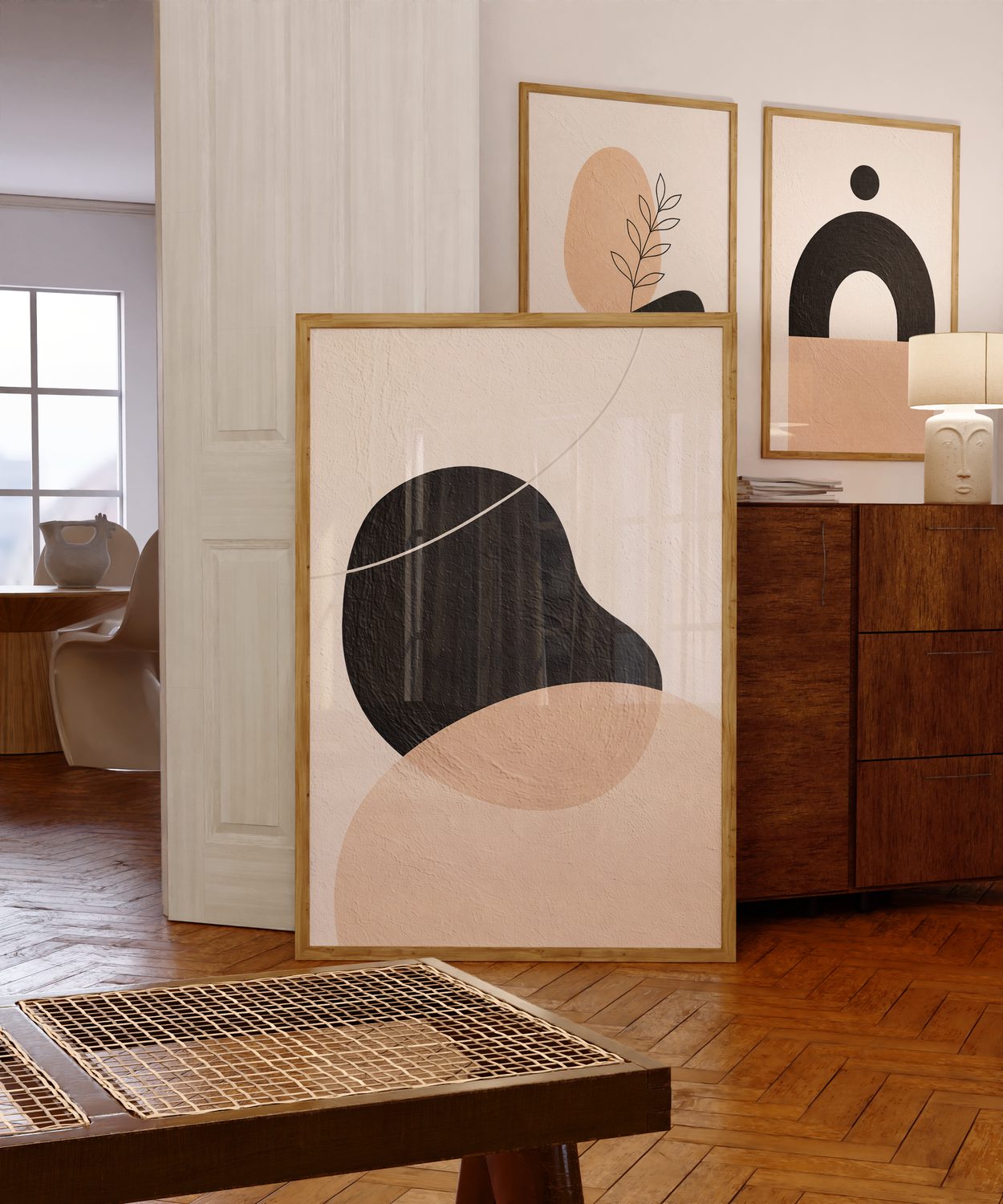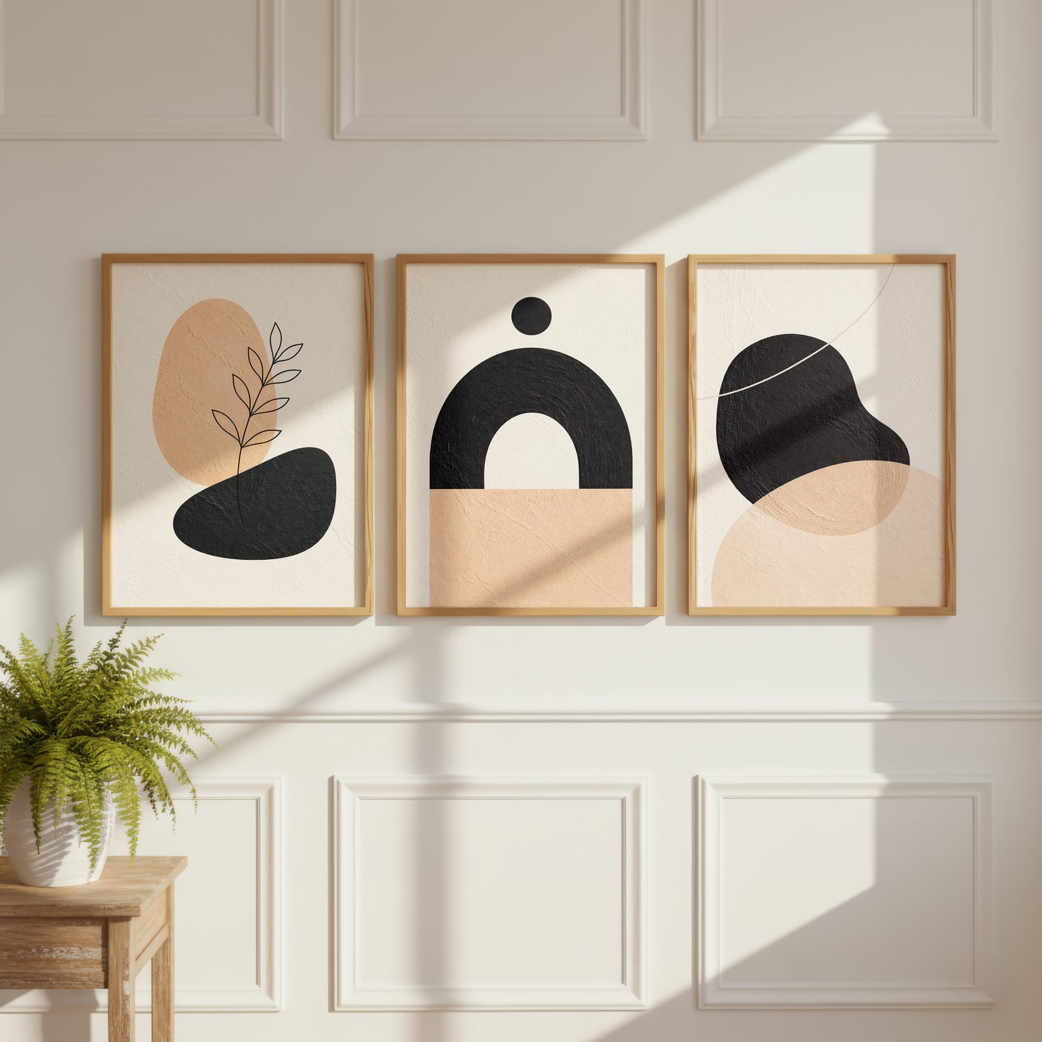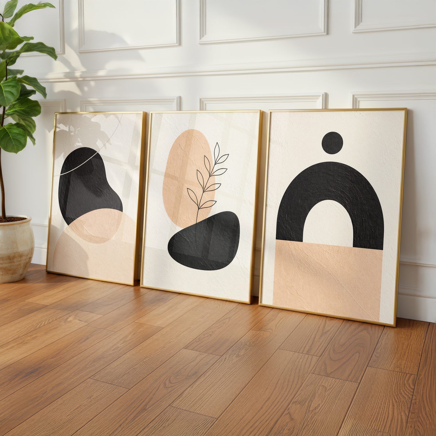 Minimalist Abstract Canvas Wall Art is a sophisticated three-piece set featuring organic geometric shapes in black, cream, and warm peach tones. Crafted on 380 GSM museum-quality canvas with premium varnish finish, each gallery-wrap piece delivers crisp, fade-resistant prints that elevate contemporary interiors with refined simplicity and timeless elegance.