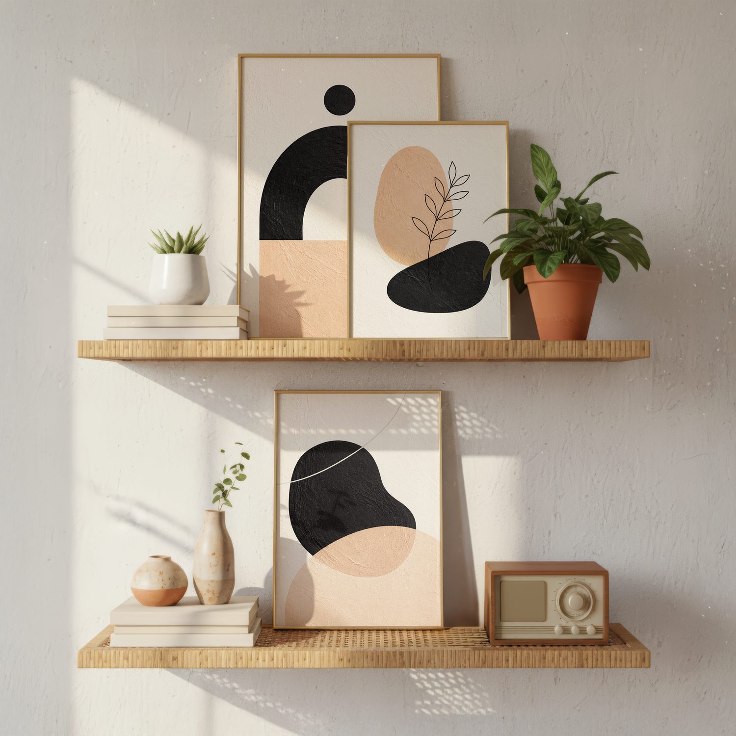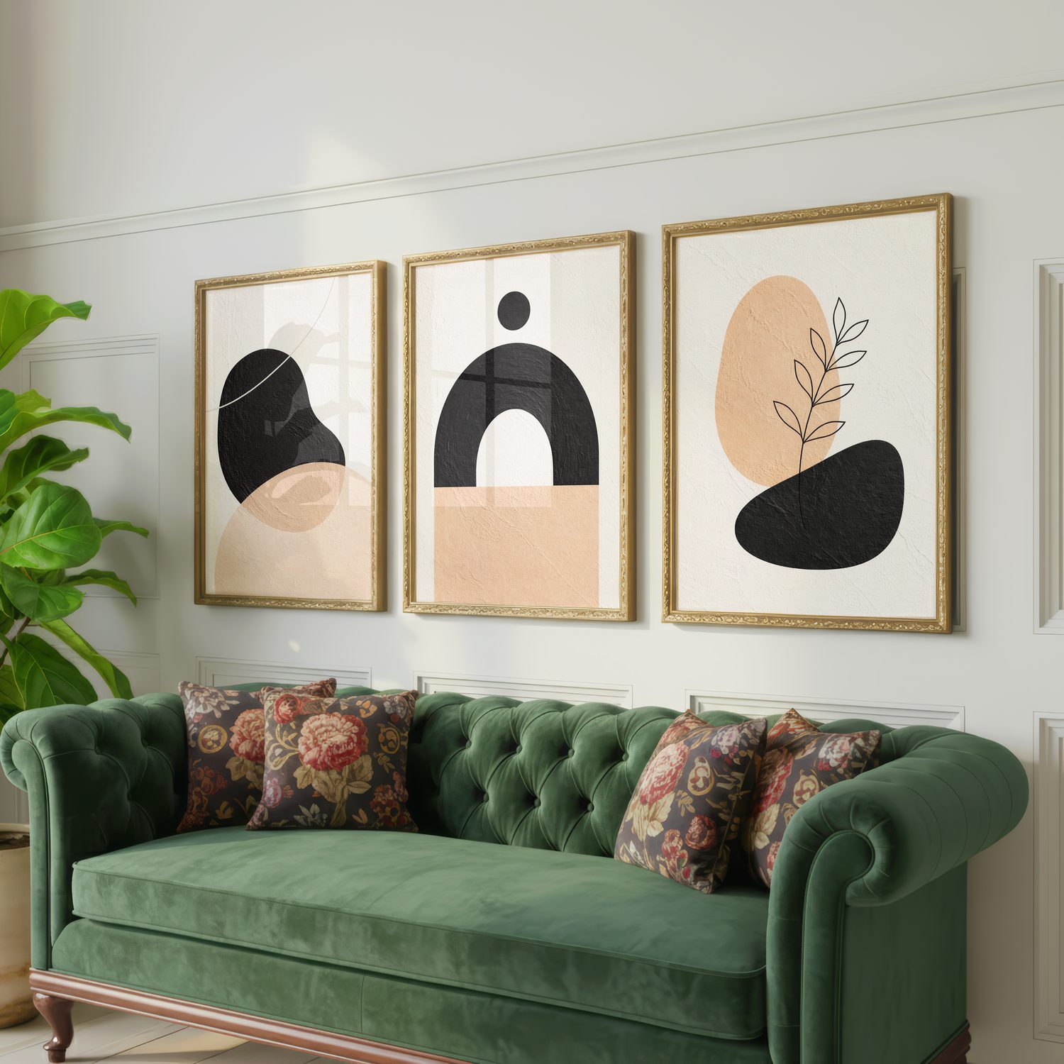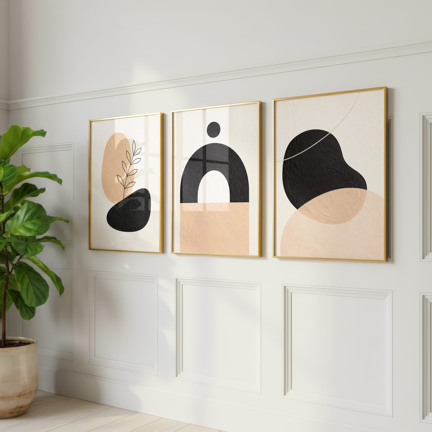 Minimalist Abstract Canvas Wall Art is a sophisticated three-piece set featuring organic geometric shapes in black, cream, and warm peach tones. Crafted on 380 GSM museum-quality canvas with premium varnish finish, each gallery-wrap piece delivers crisp, fade-resistant prints that elevate contemporary interiors with refined simplicity and timeless elegance.