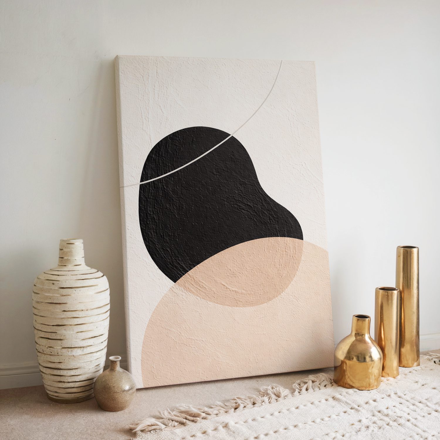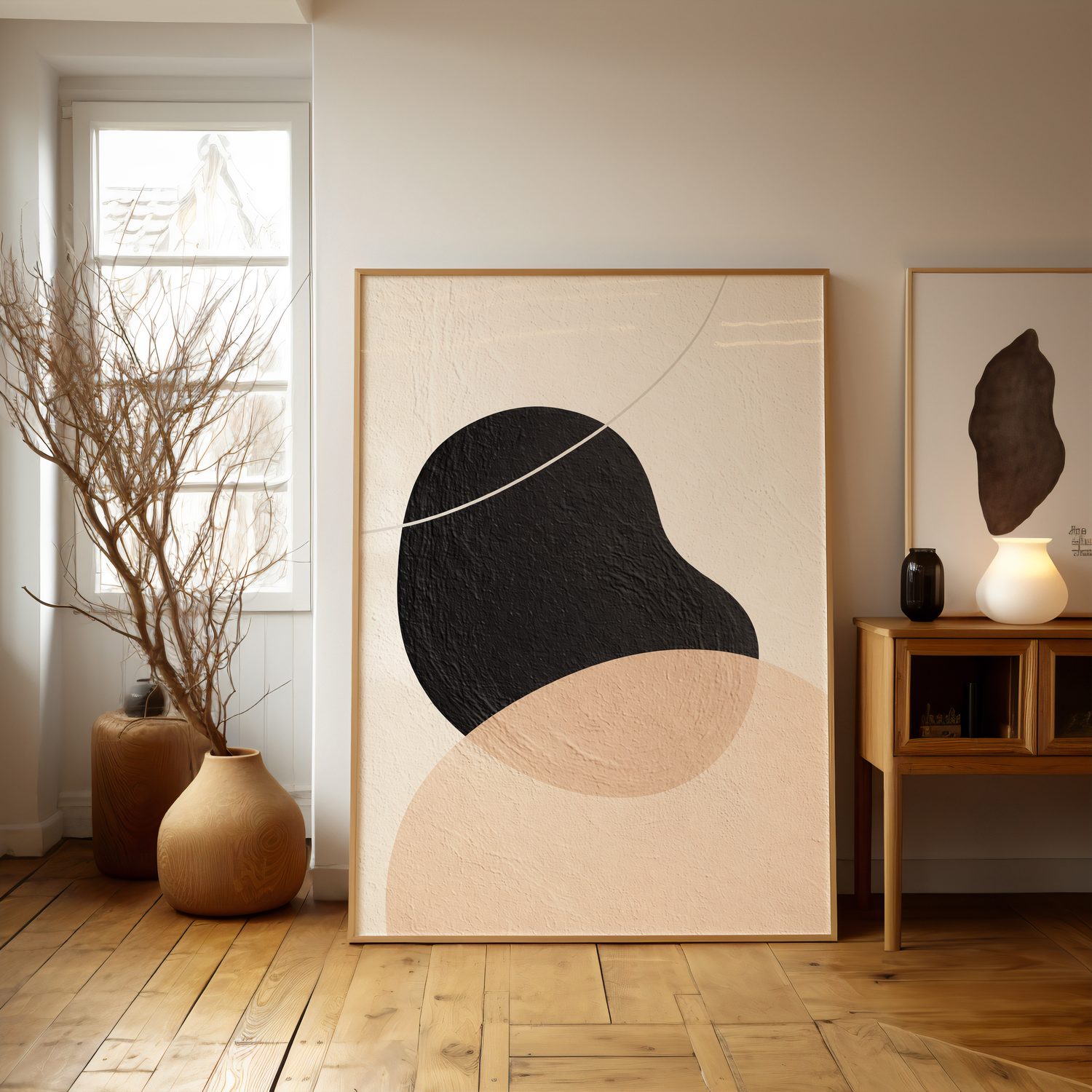 This minimalist canvas collection creates visual breathing room through refined restraint and balanced composition. Organic forms evoke nature without literal representation, triggering calm contemplation while dynamic asymmetry prevents monotony. The interplay of black silhouettes against warm neutrals fosters focus, clarity, and peaceful sophistication — crafted for modern homes seeking understated artistic elegance.