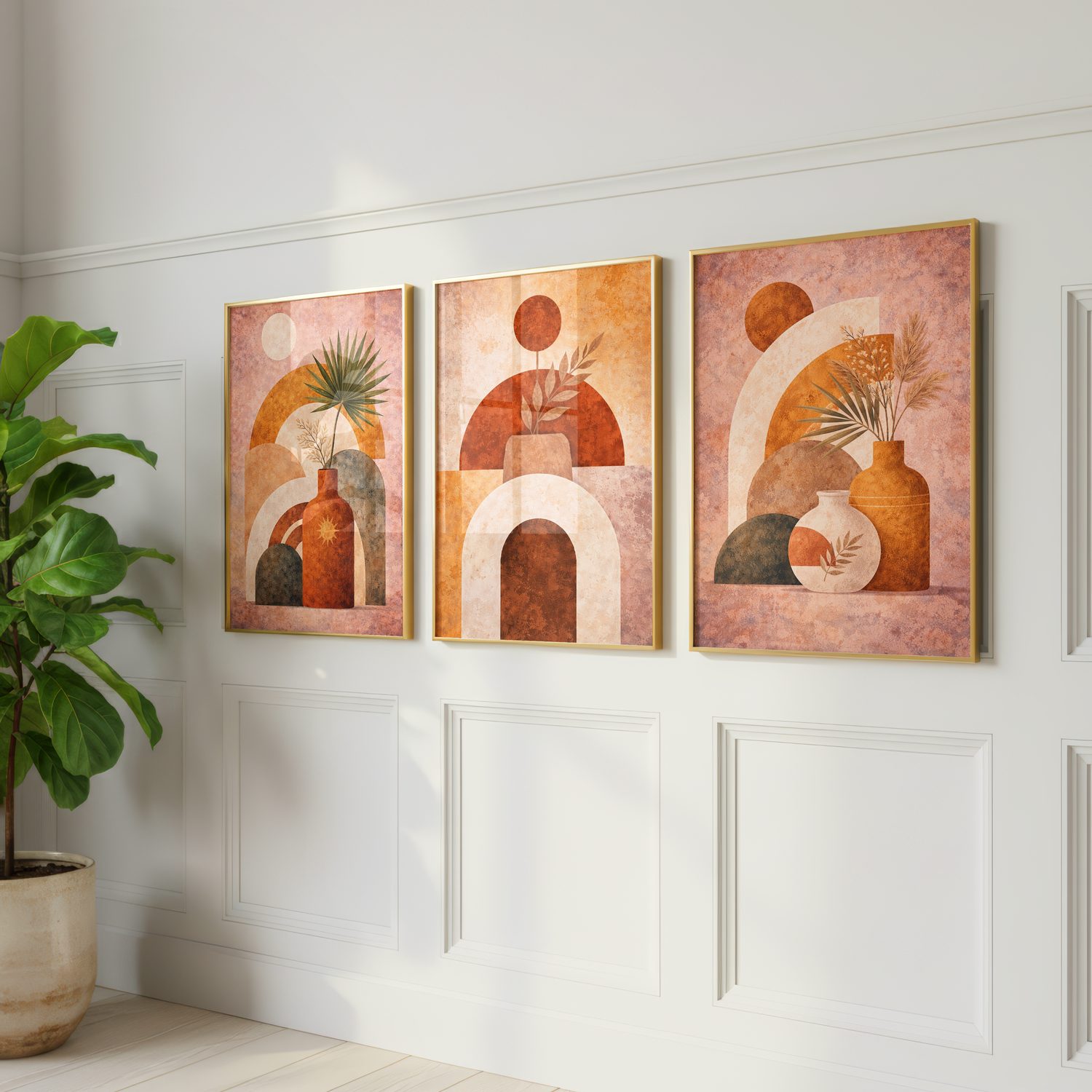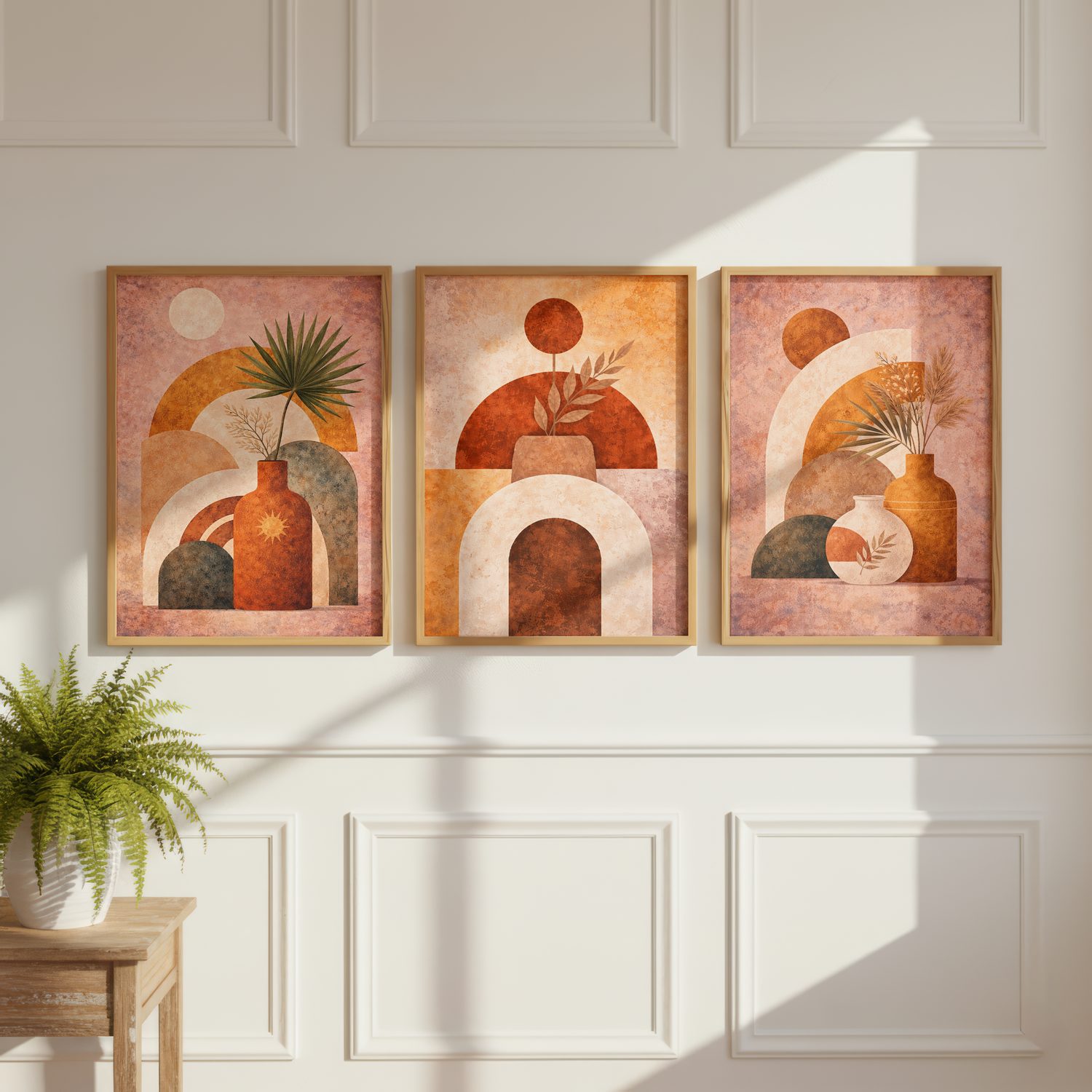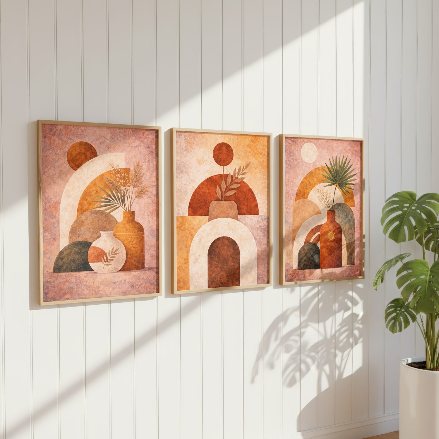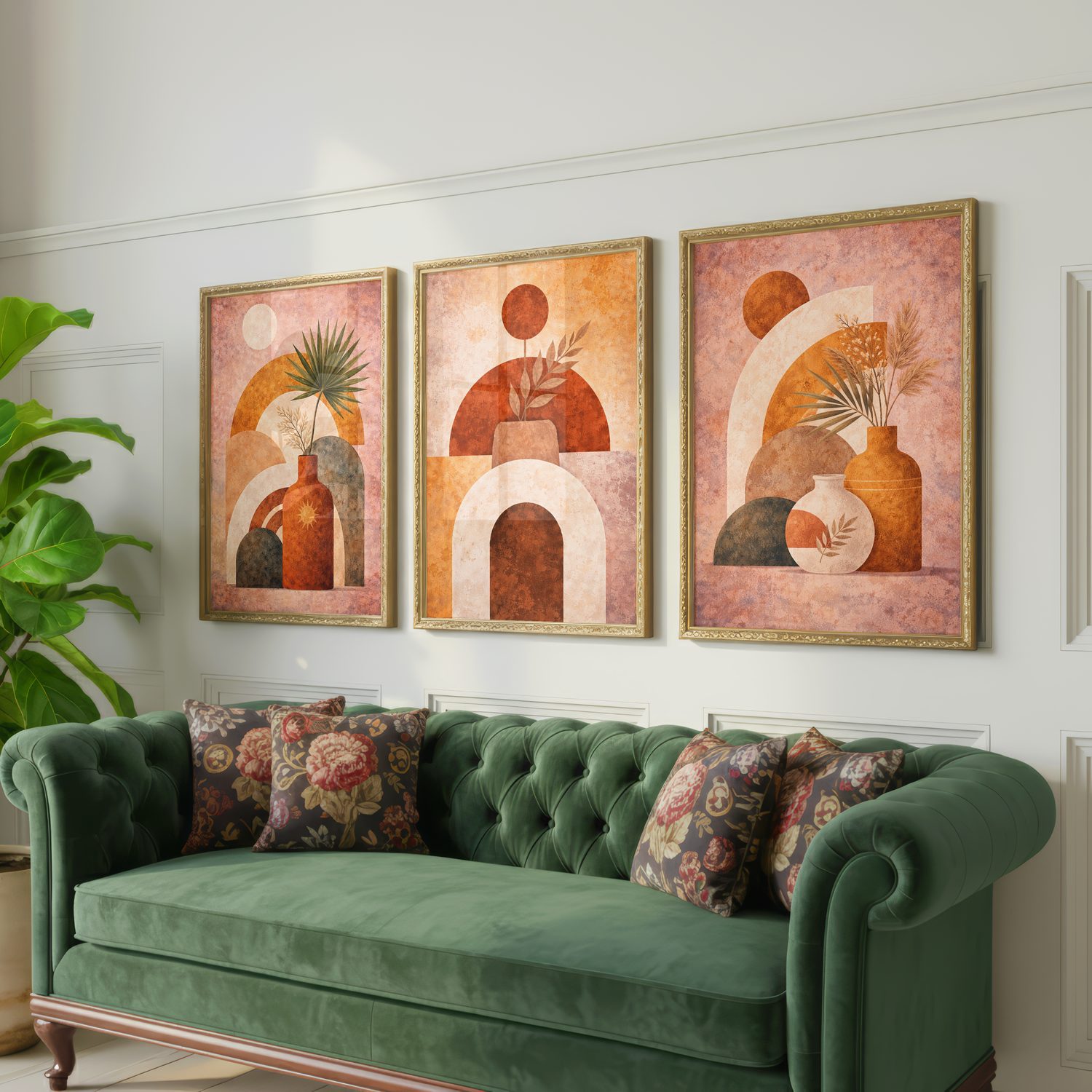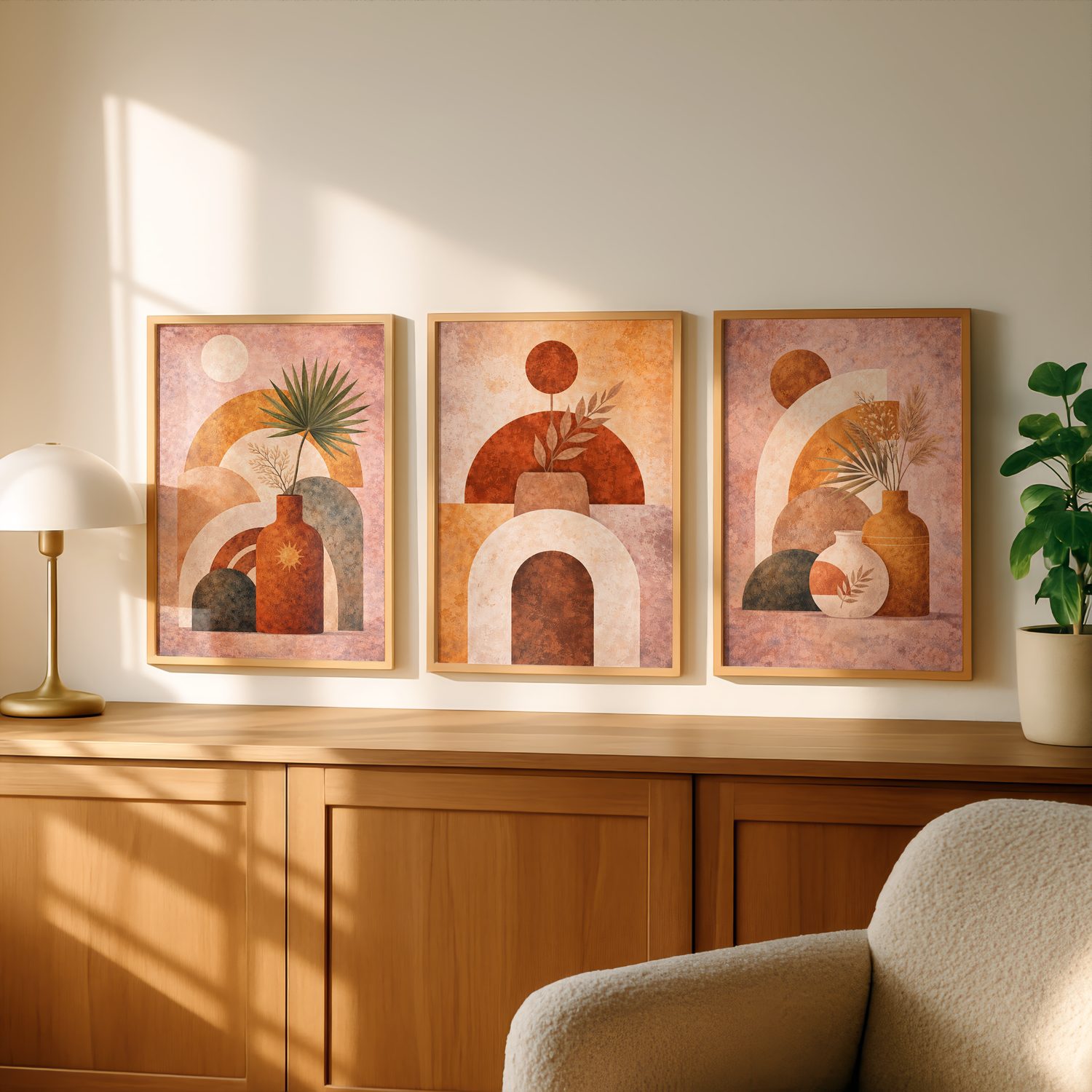 Boho Abstract Arches Canvas Wall Art is a serene three-piece collection featuring geometric arches, celestial moons and suns, and botanical elements in sage green, rust, terracotta, cream, and dusty pink tones. Crafted on 380 GSM museum-quality canvas with premium varnish finish, these gallery-wrap pieces balance organic form with intentional composition for spaces seeking warmth and timeless bohemian elegance.