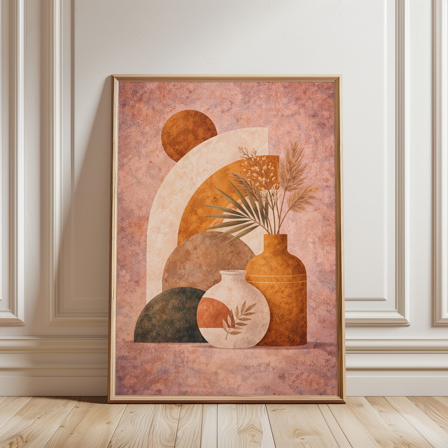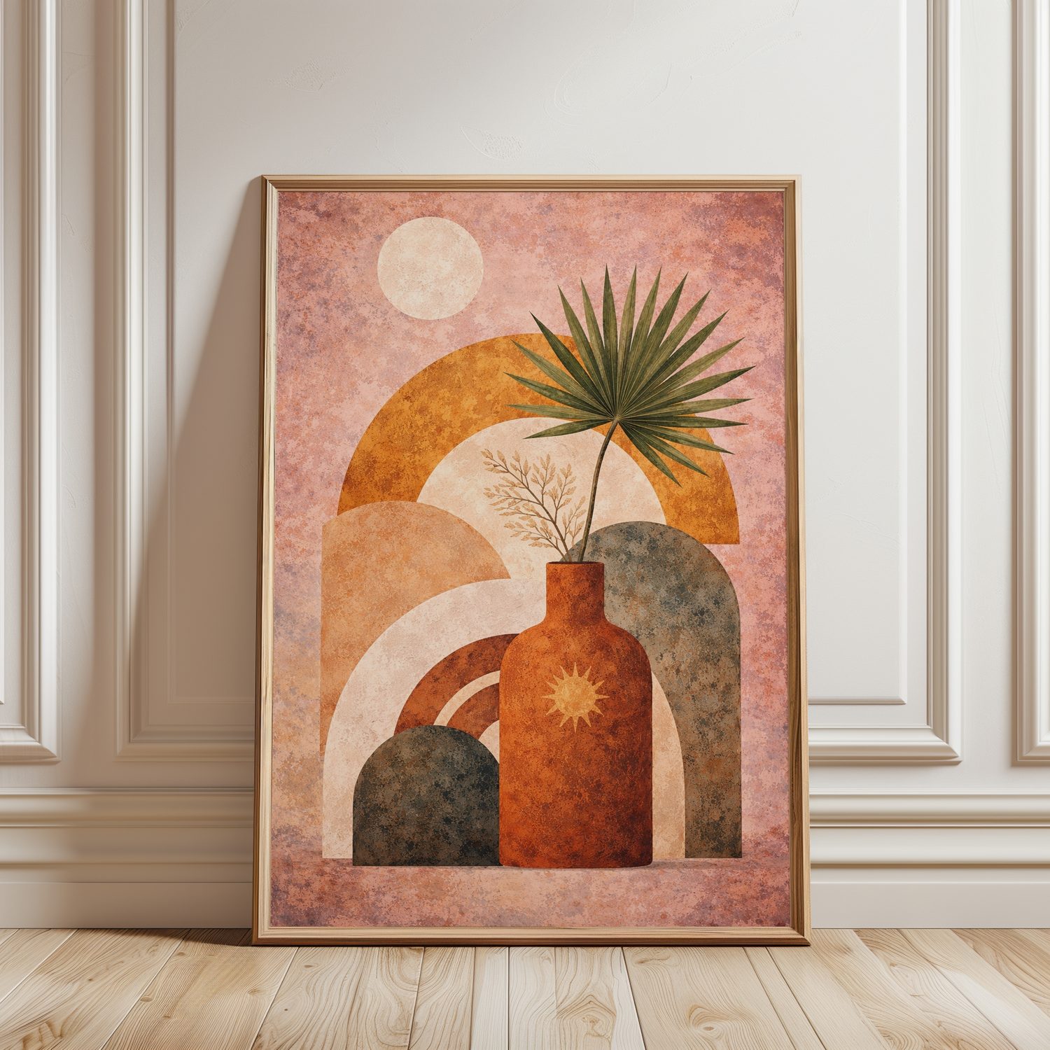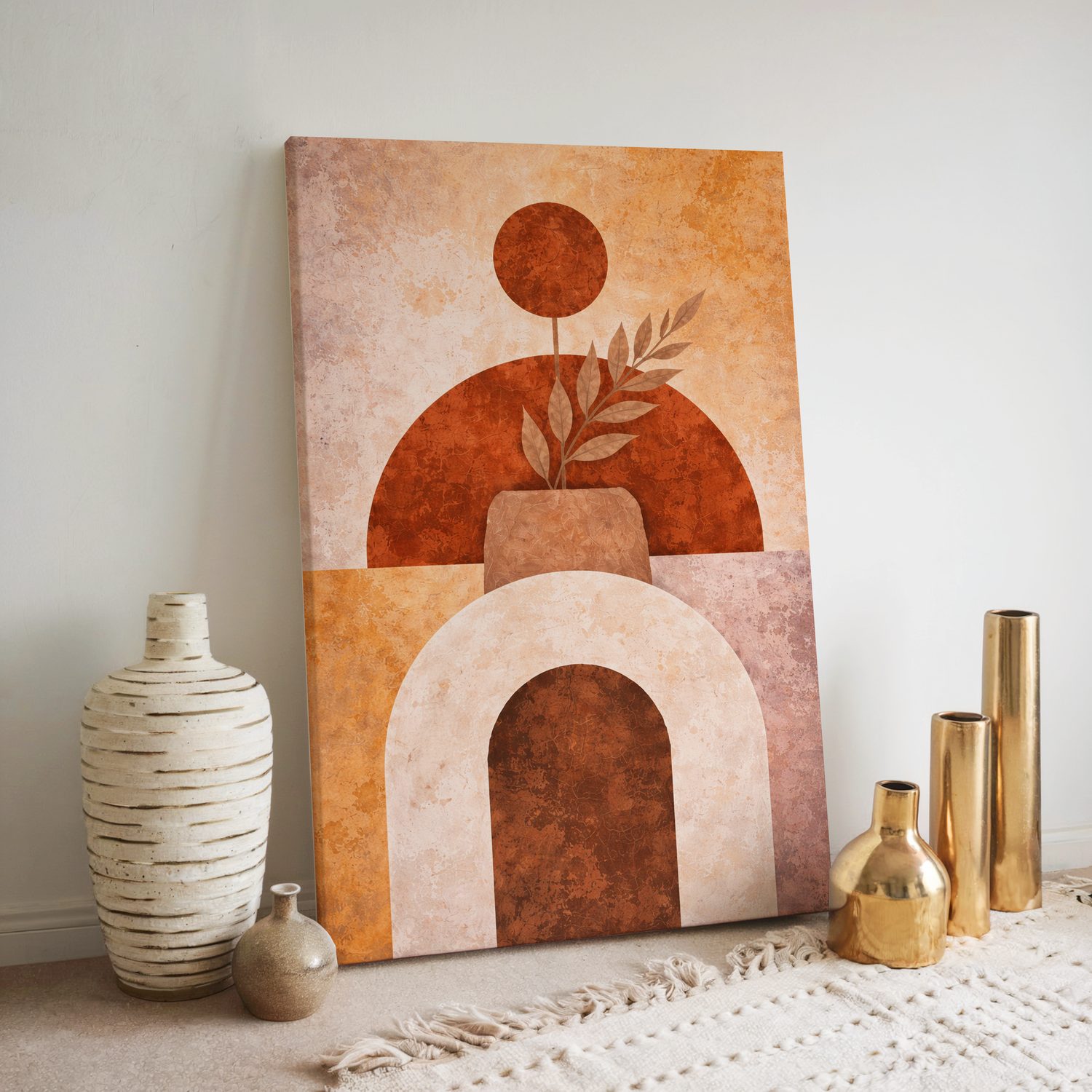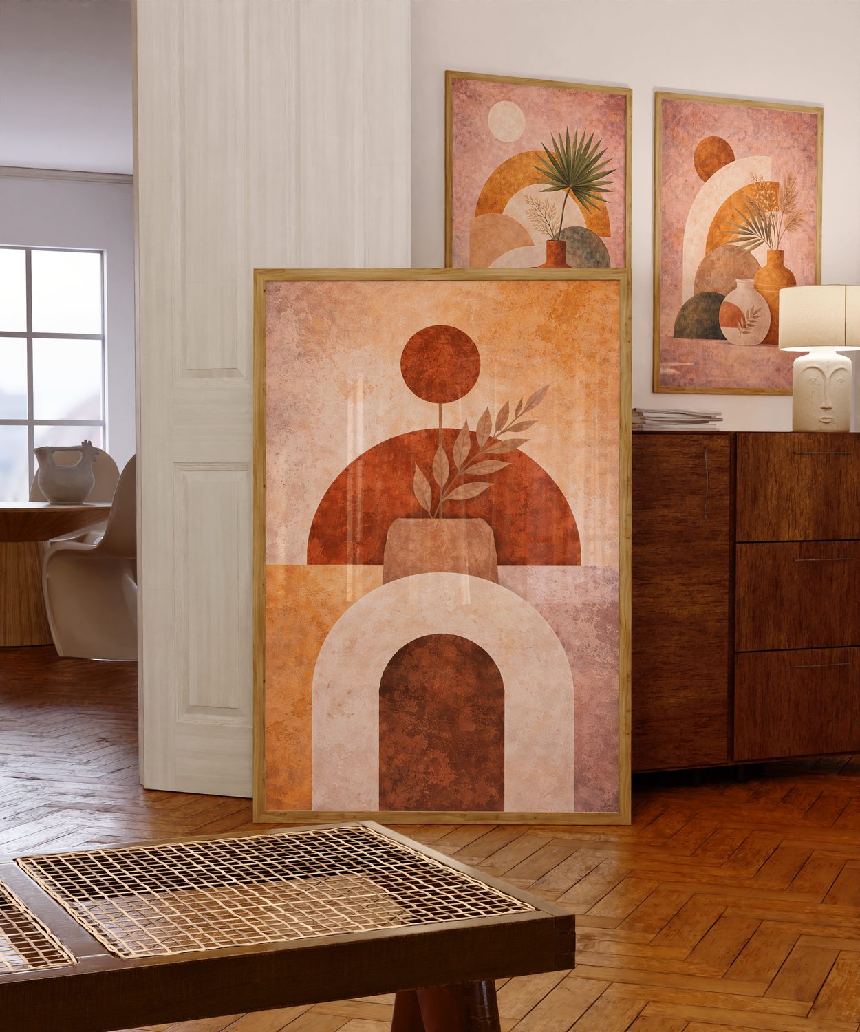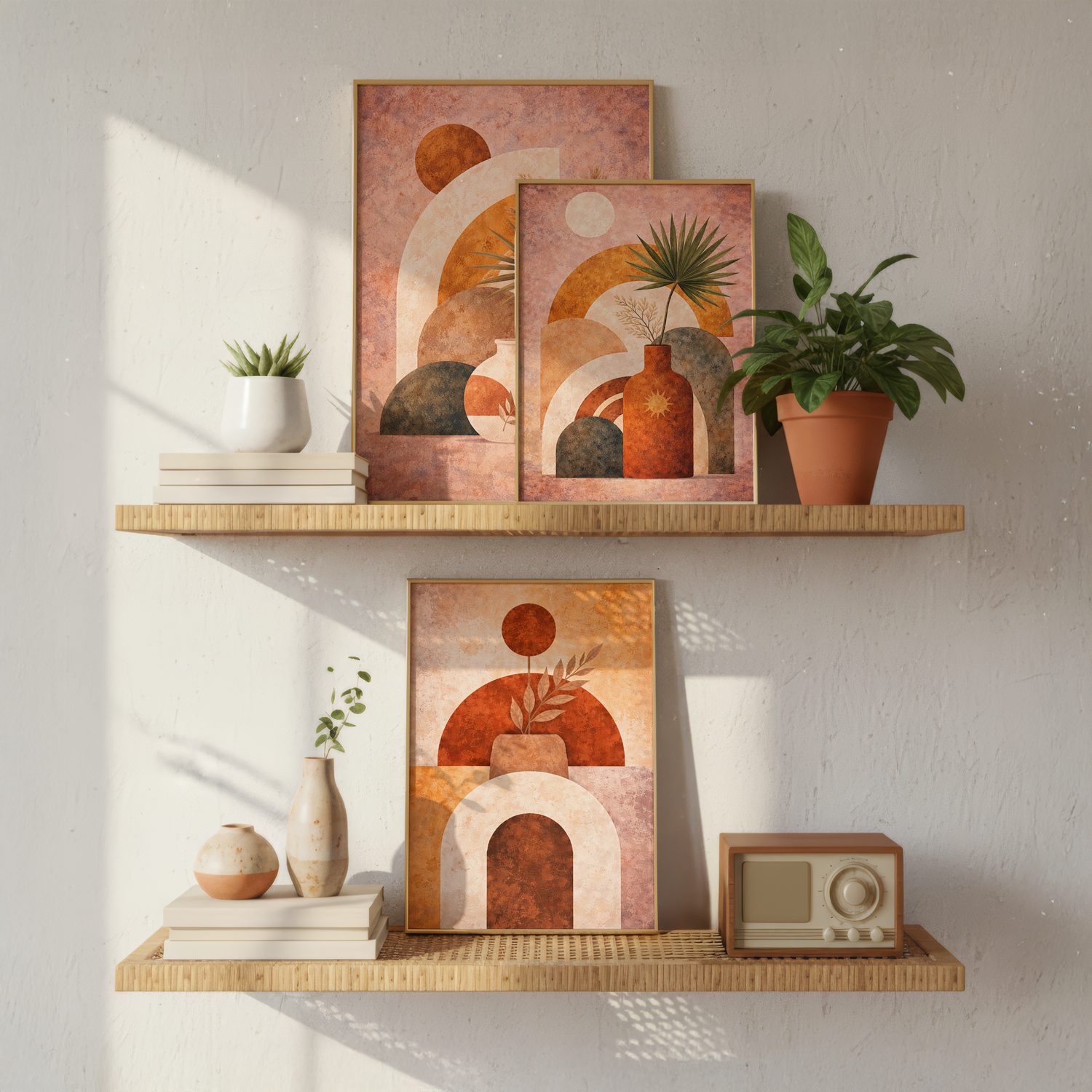 Boho Abstract Arches Canvas Wall Art is a serene three-piece collection featuring geometric arches, celestial moons and suns, and botanical elements in sage green, rust, terracotta, cream, and dusty pink tones. Crafted on 380 GSM museum-quality canvas with premium varnish finish, these gallery-wrap pieces balance organic form with intentional composition for spaces seeking warmth and timeless bohemian elegance.