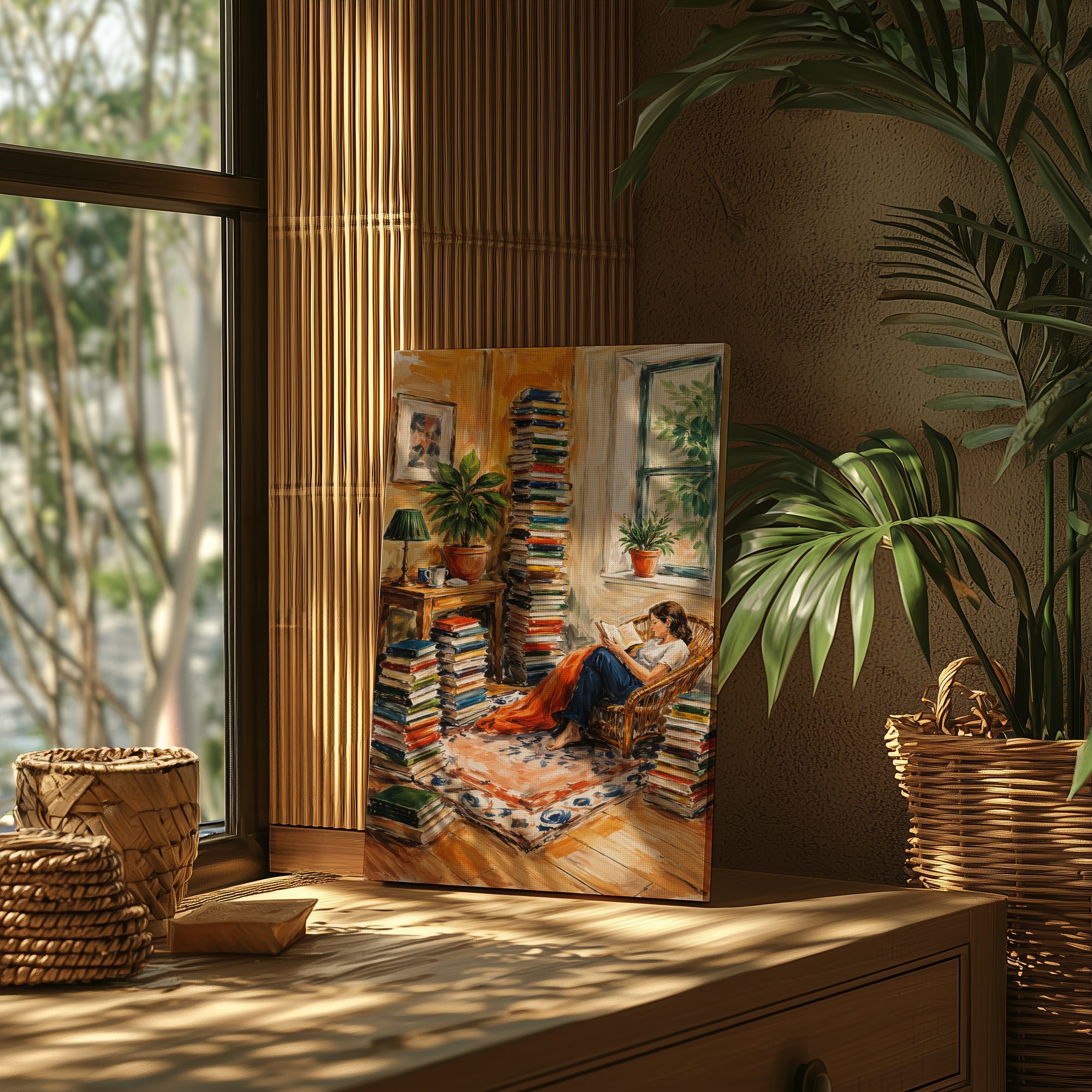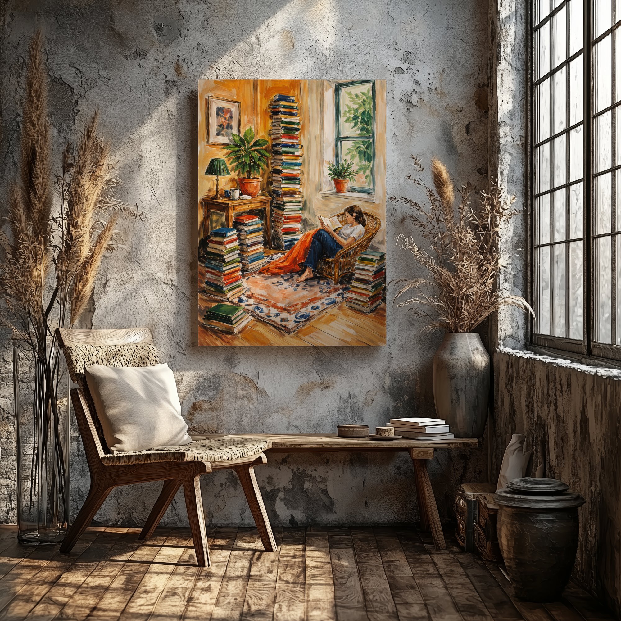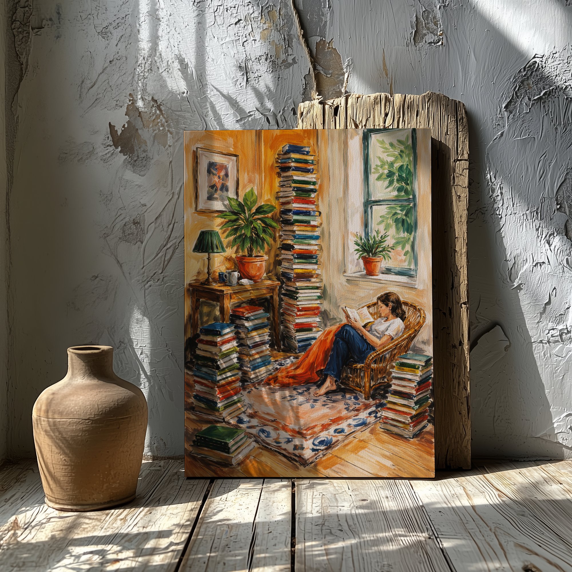 Evokes the peaceful comfort of an afternoon spent reading — warm, nostalgic, and deeply personal. The rich palette and expressive brushwork create a sense of intimacy that makes any space feel like a cherished reading corner.