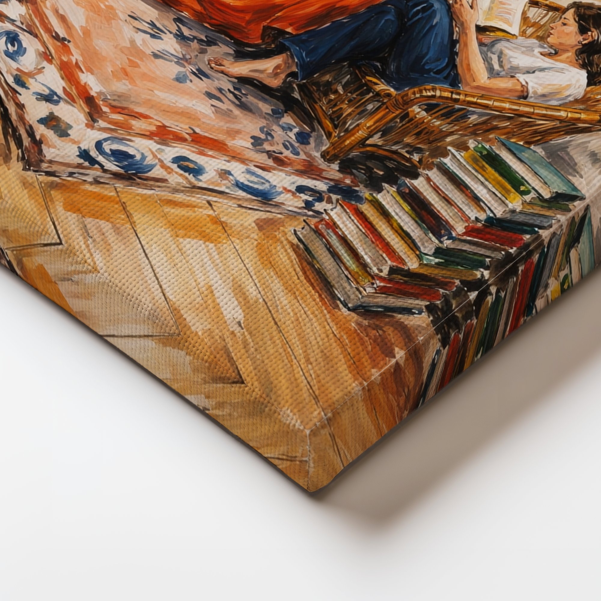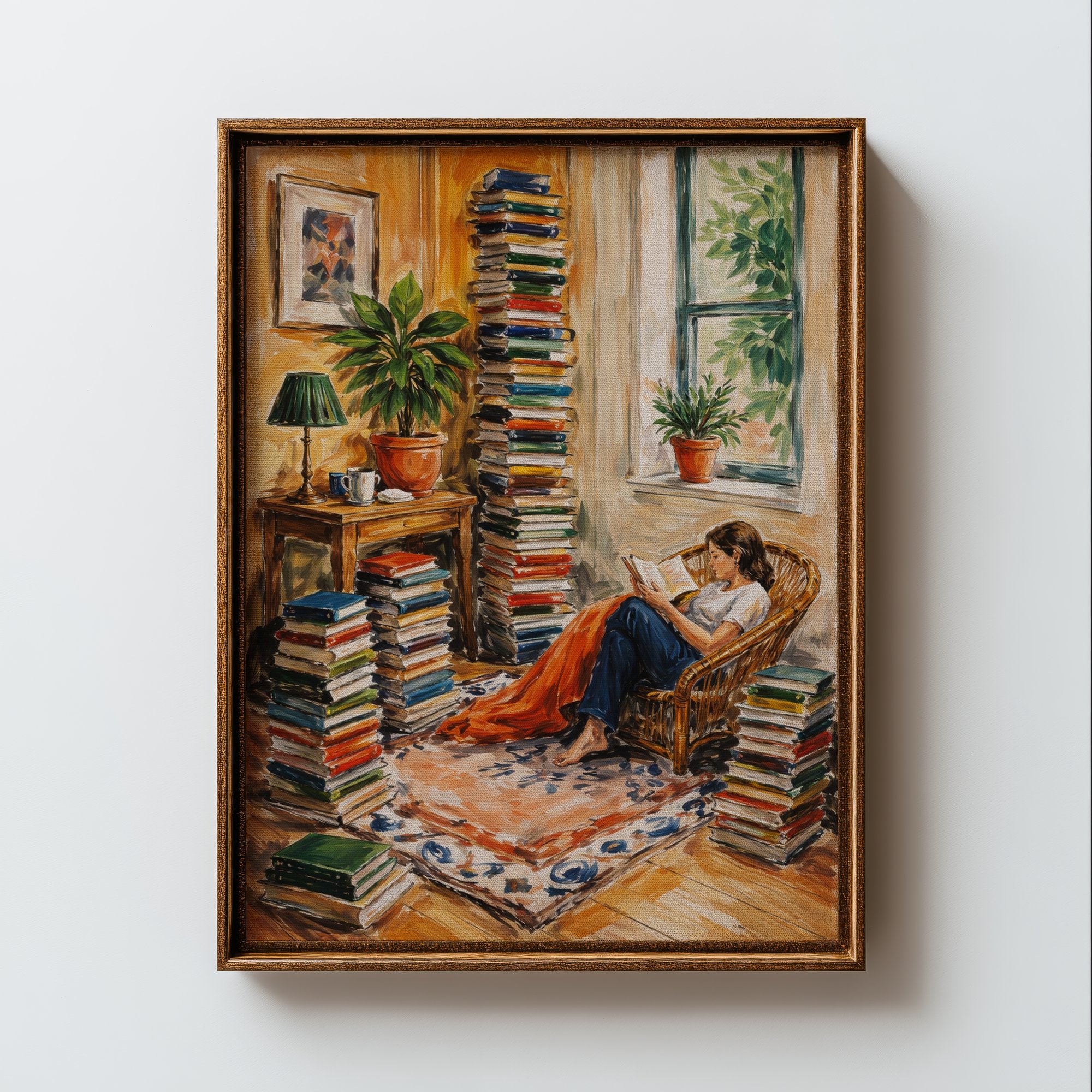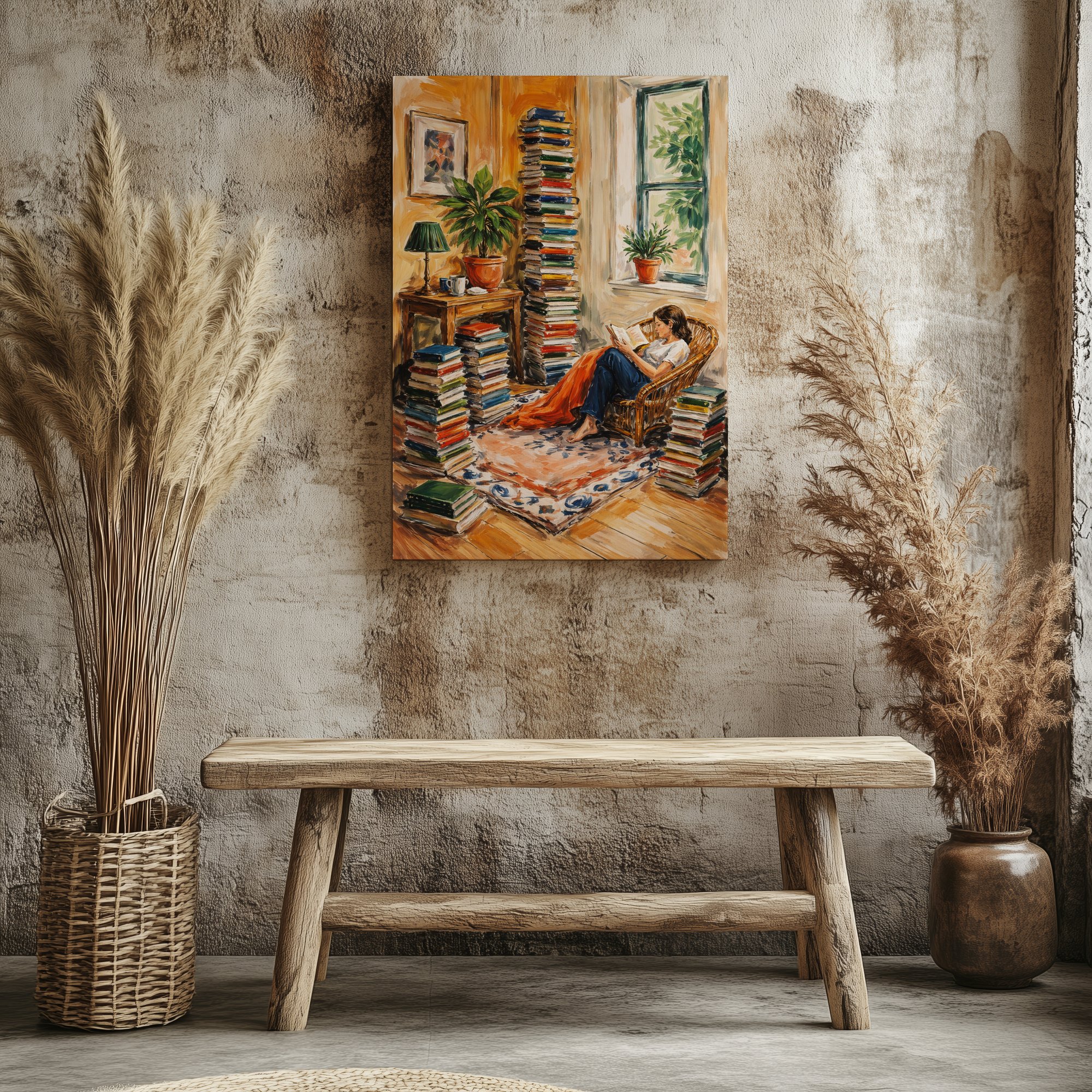 Evokes the peaceful comfort of an afternoon spent reading — warm, nostalgic, and deeply personal. The rich palette and expressive brushwork create a sense of intimacy that makes any space feel like a cherished reading corner.