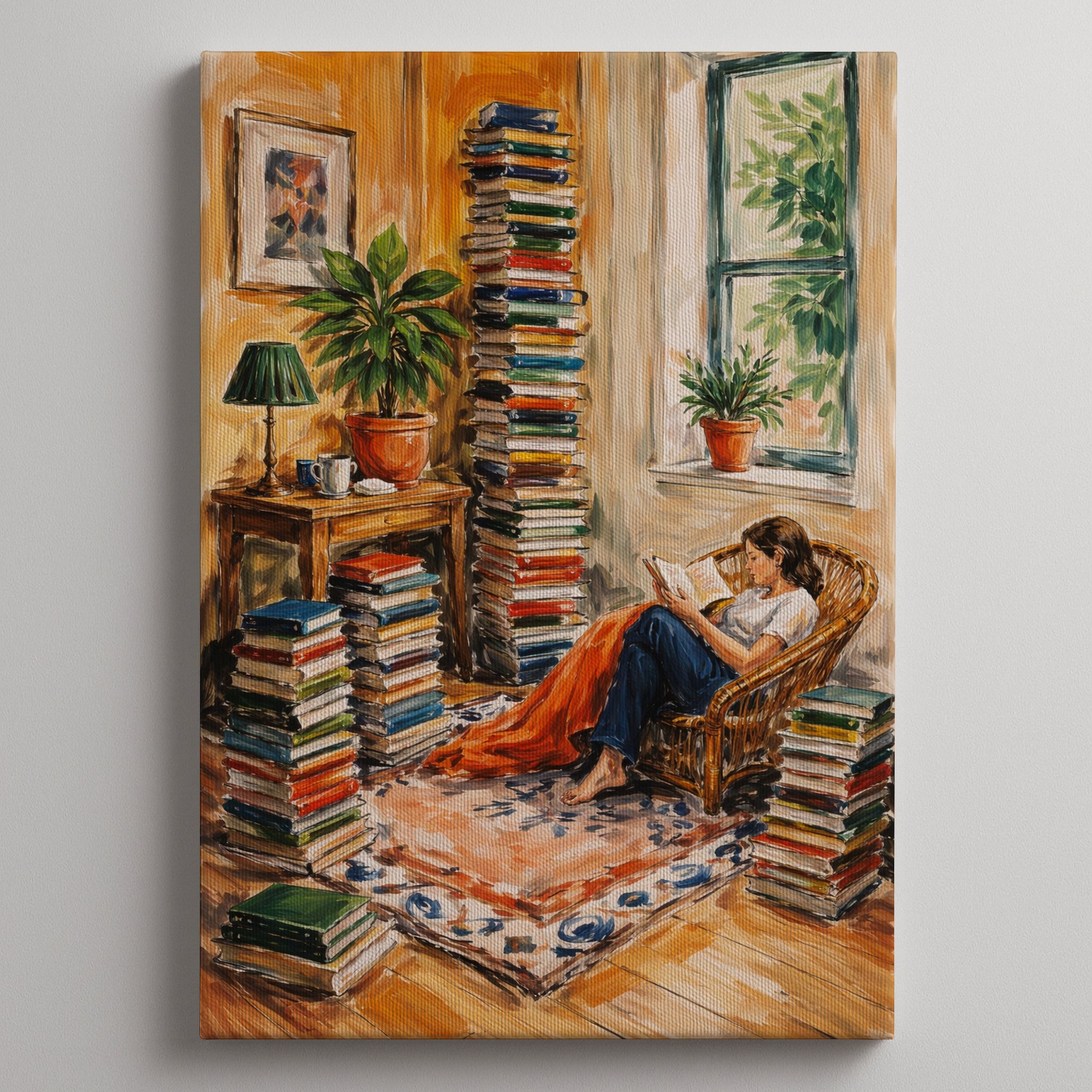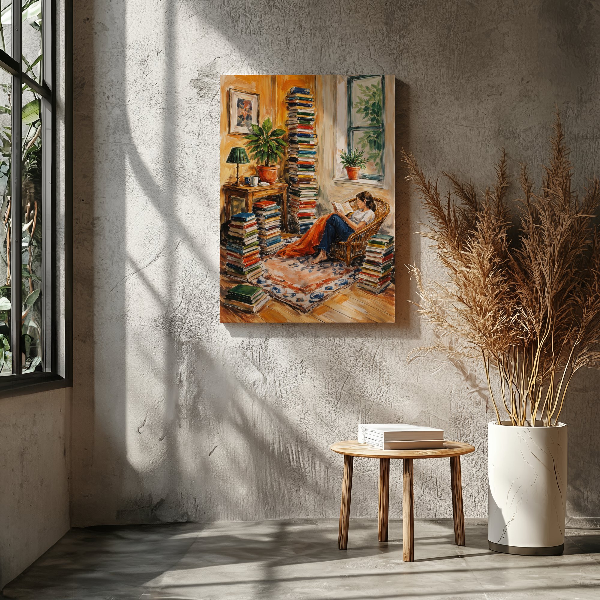 A woman lost in a book amid towering stacks of colourful volumes in a sun-drenched room — this warm literary canvas captures the quiet joy of reading. Rich amber, orange, and earthy tones with touches of green create a cosy, inviting atmosphere that celebrates the beauty of a personal reading space.