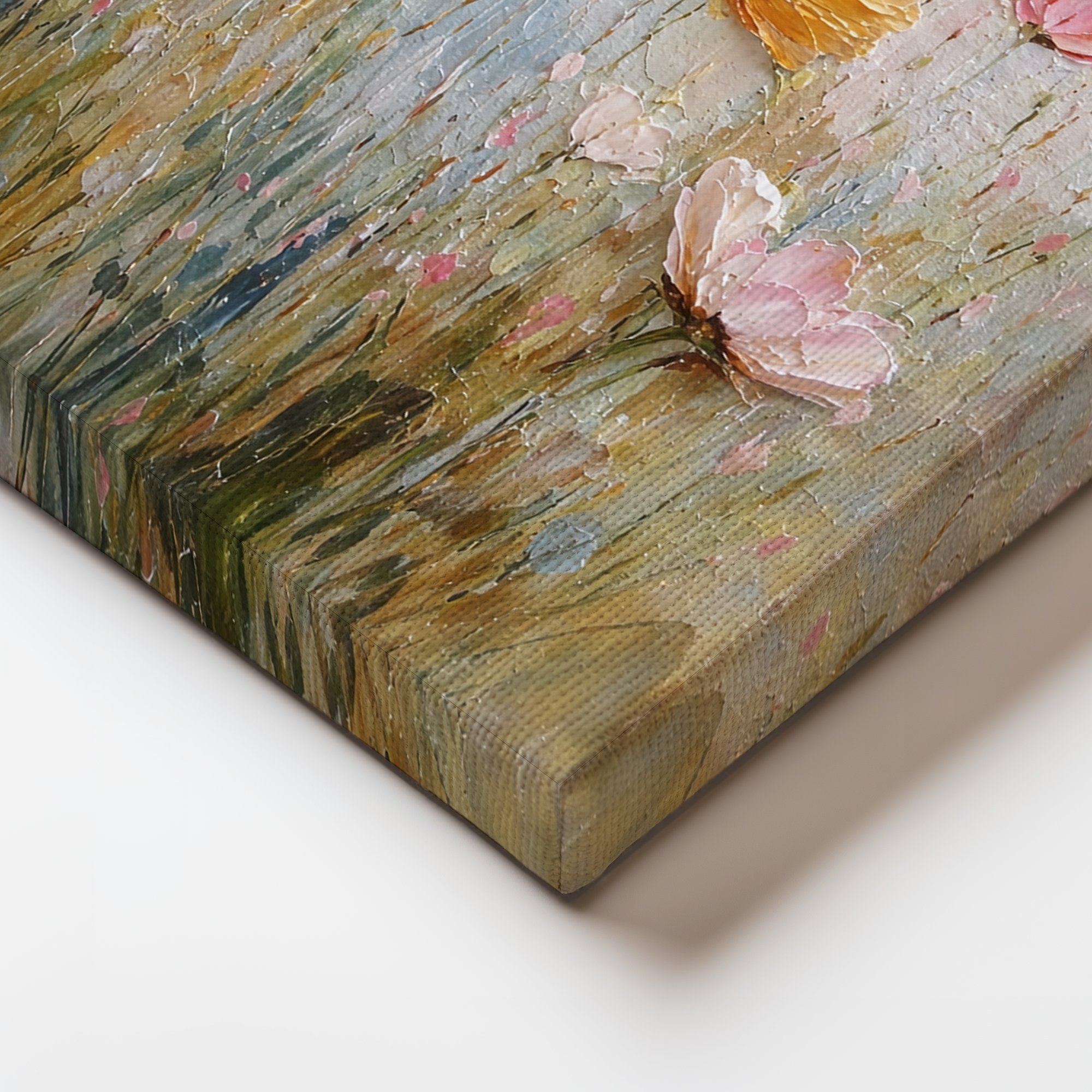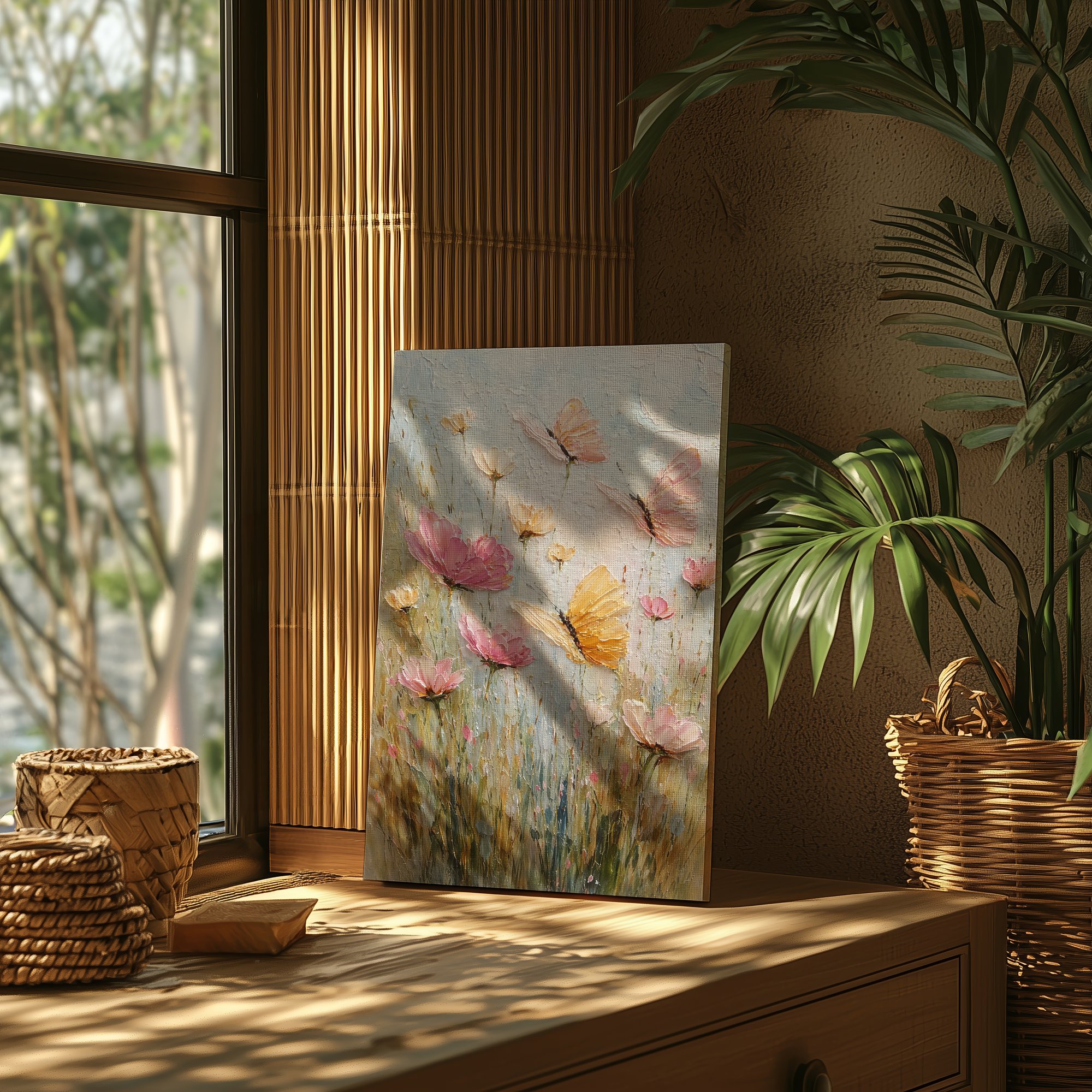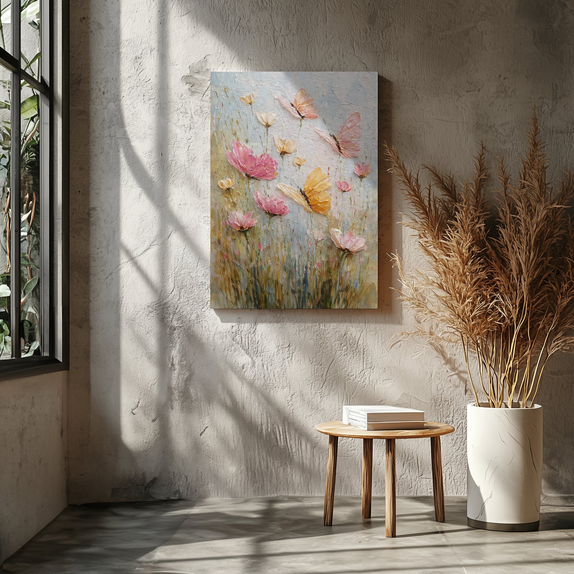 Evokes the gentle magic of a butterfly garden — serene, romantic, and effortlessly beautiful. The textured surface adds a hand-painted, gallery-quality feel that draws you in.