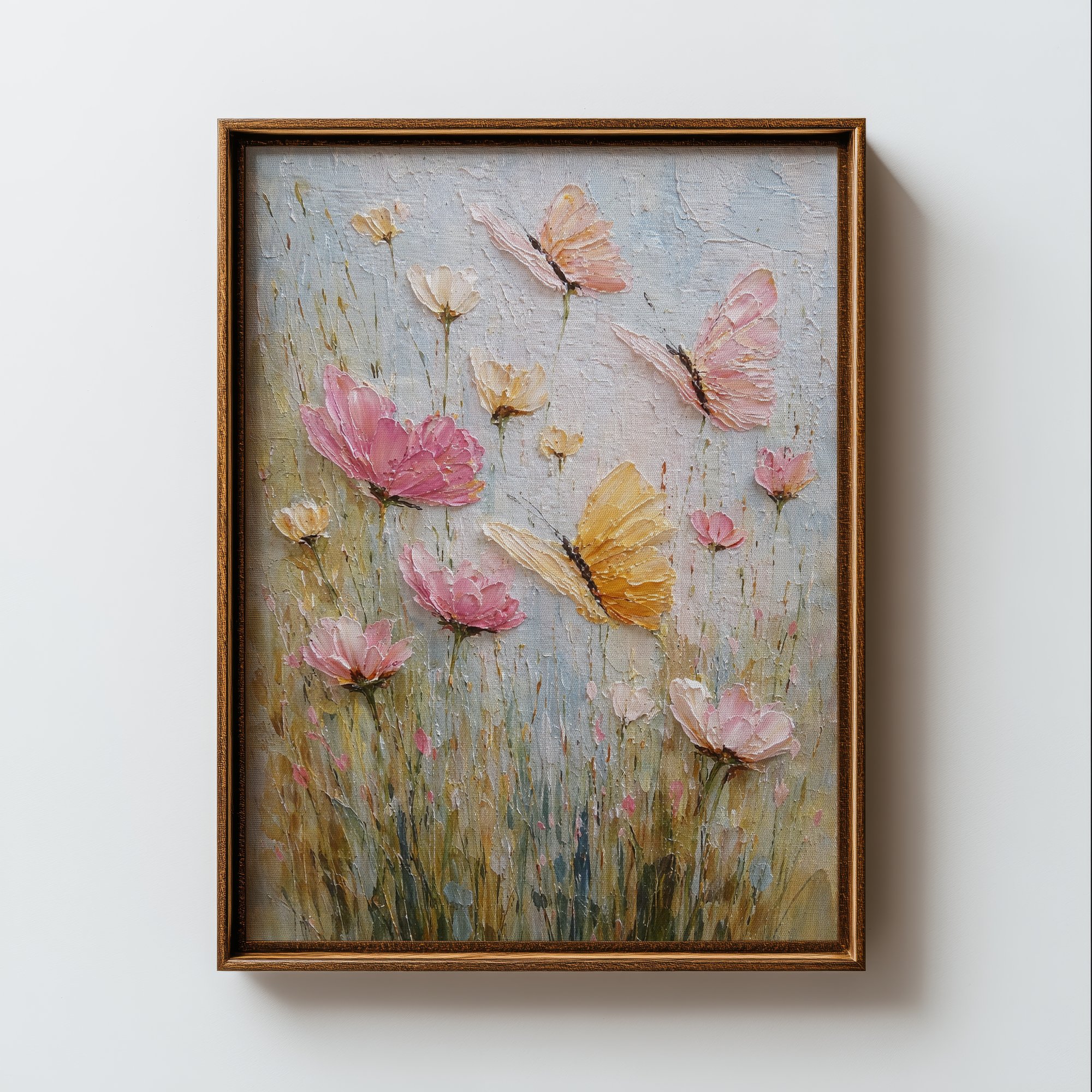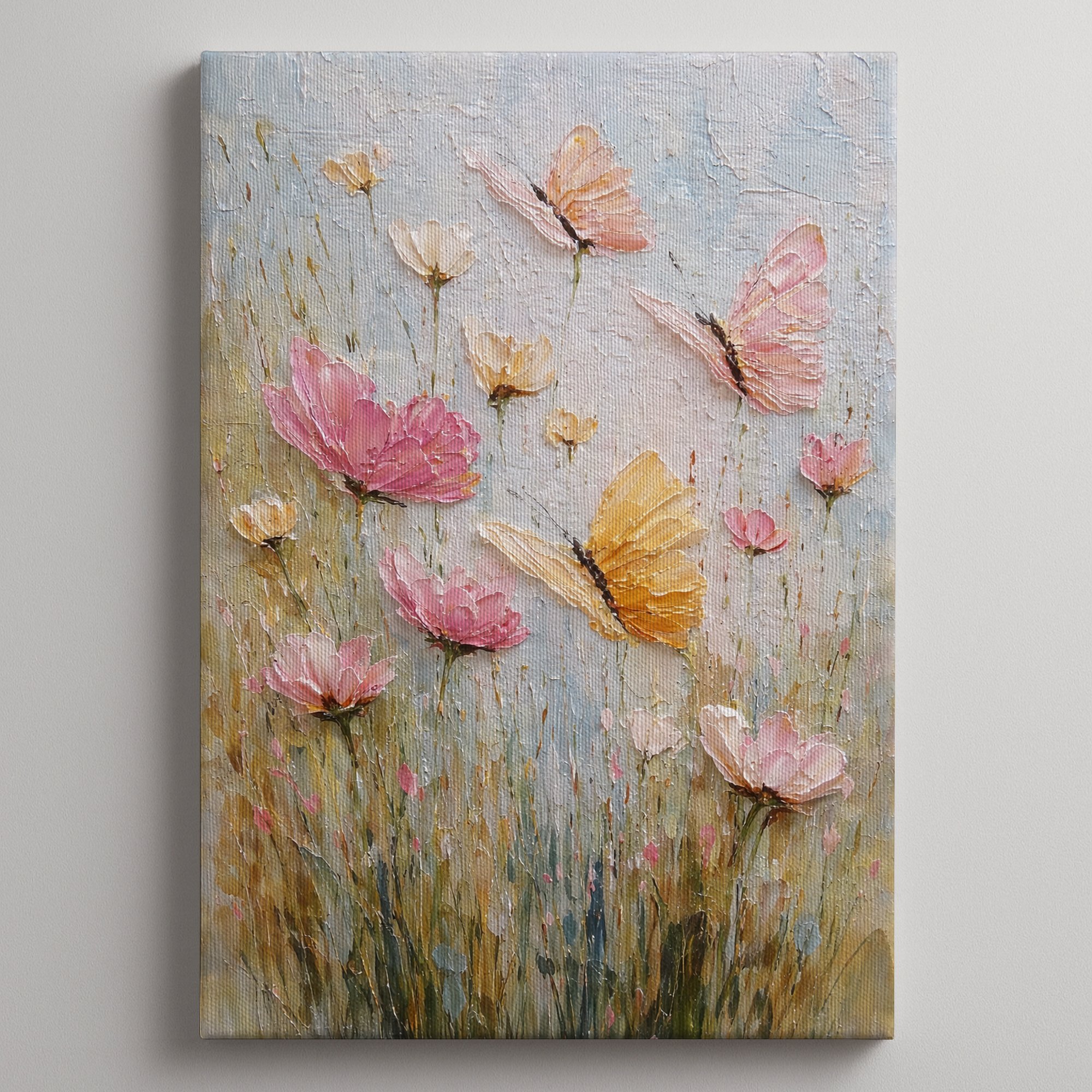 Pink cosmos flowers and golden butterflies dance across a soft pastel sky in this dreamy textured canvas. Thick impasto brushwork in blush, pink, gold, and sage green creates a composition that feels like a gentle spring morning — delicate, warm, and full of movement.