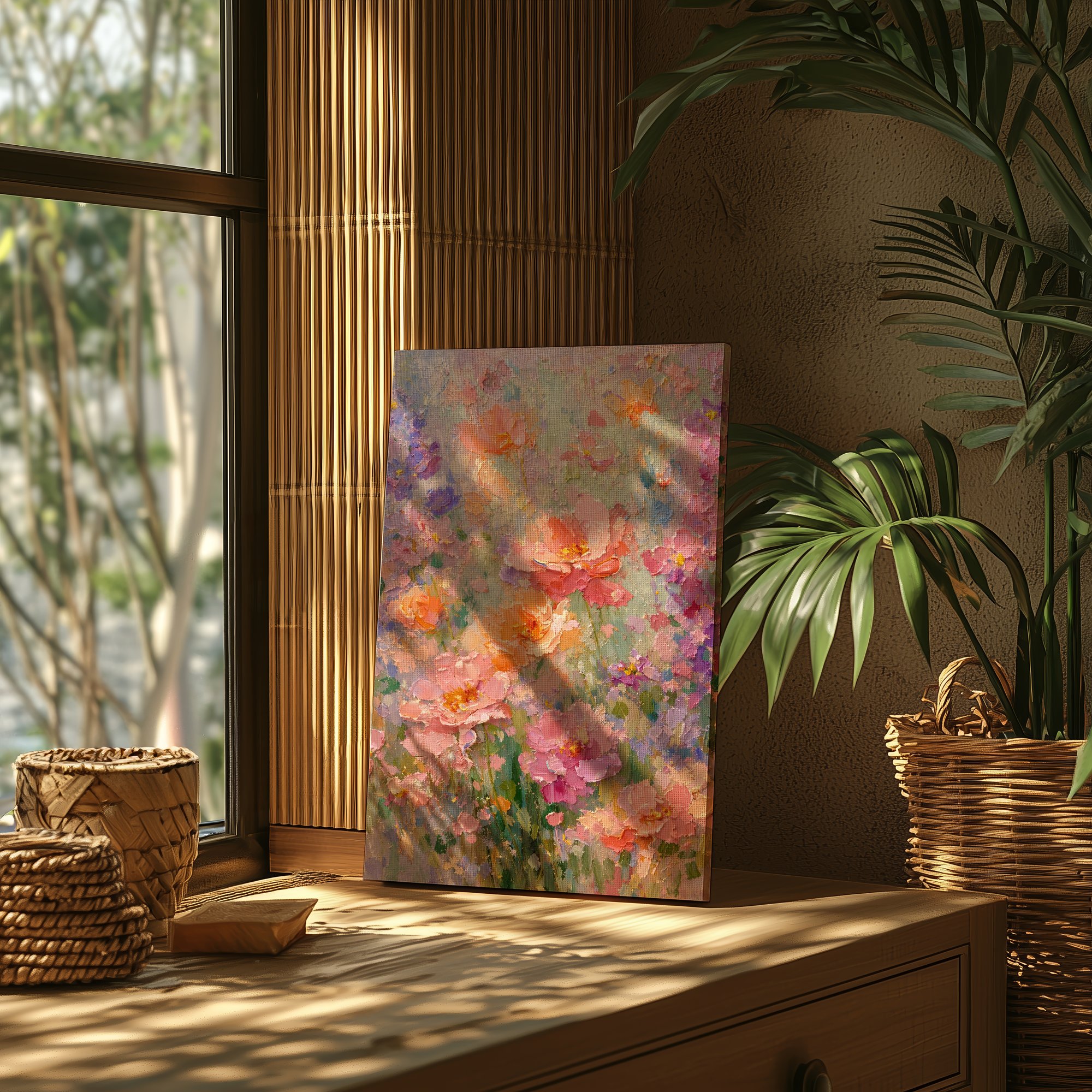 Pink and white daisies scattered across a sunlit meadow with misty trees in the soft background — this dreamy landscape canvas captures the quiet beauty of an English cottage garden. Gentle greens, warm pinks, and hazy pastels create a serene, pastoral composition.