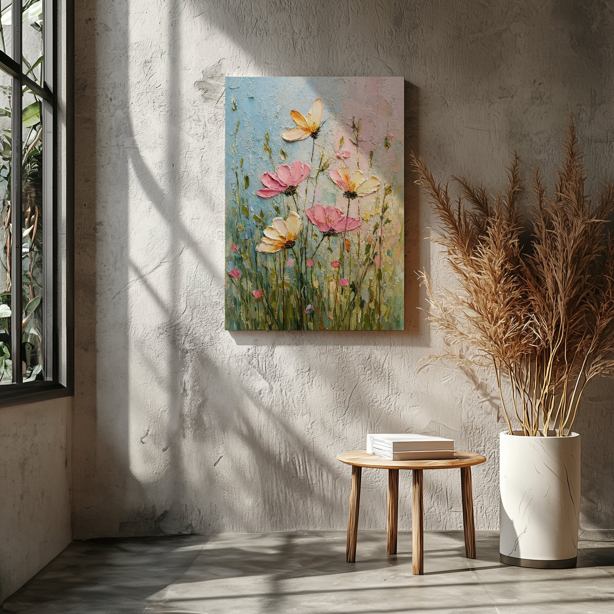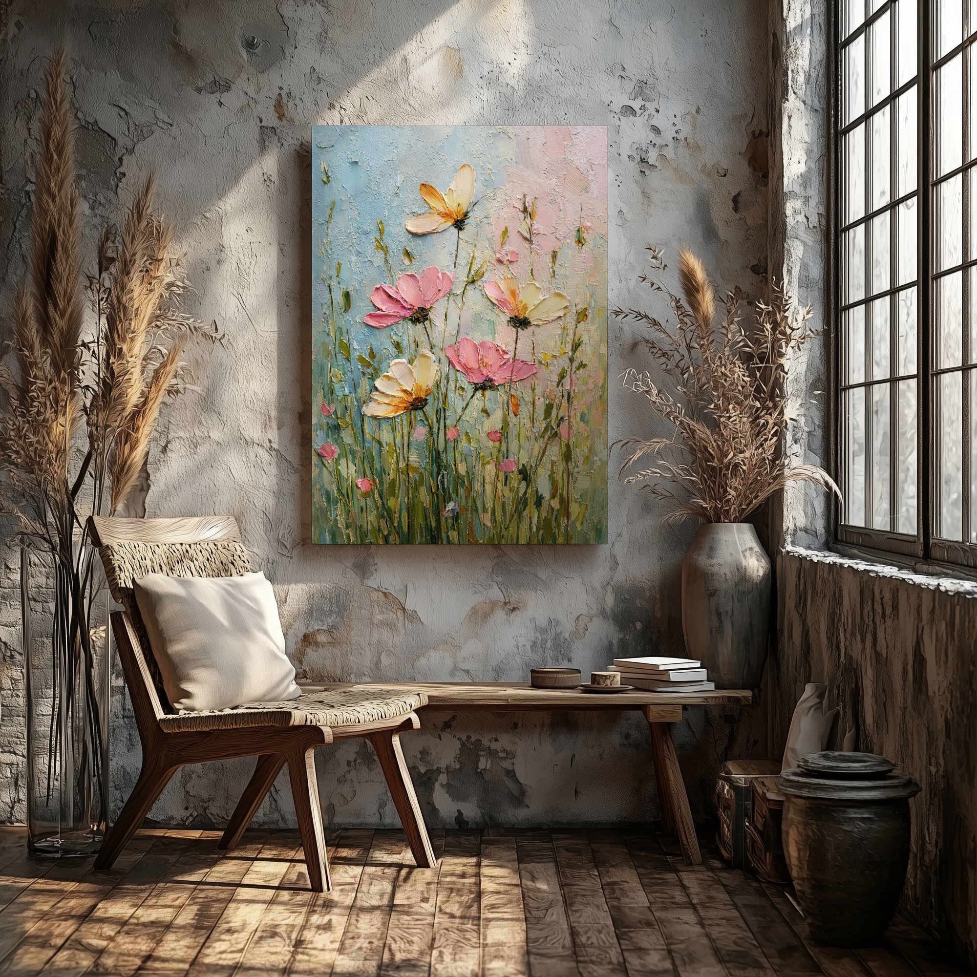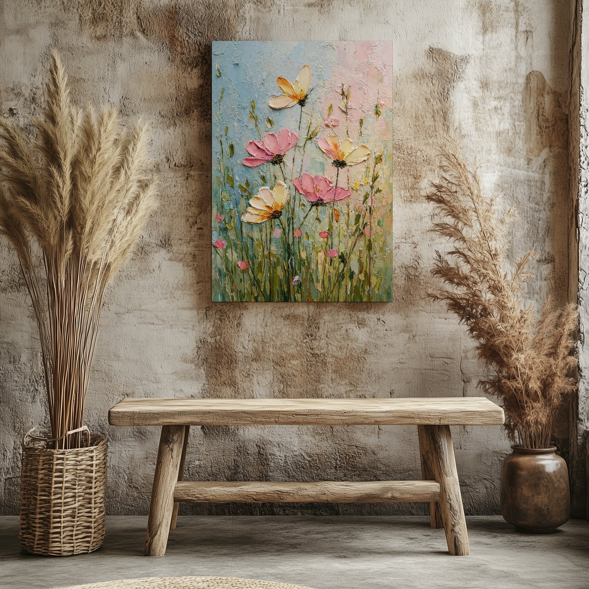A stunning focal point above a living room sofa, a vibrant accent in a bedroom, or a bold statement piece in a dining room. Also works beautifully in a dressing room or feminine home office. Pairs with modern classic, maximalist, boho, French country, and warm contemporary interiors — complements blush or coral cushions, gold-toned accents, velvet upholstery, and rooms with warm ambient lighting.