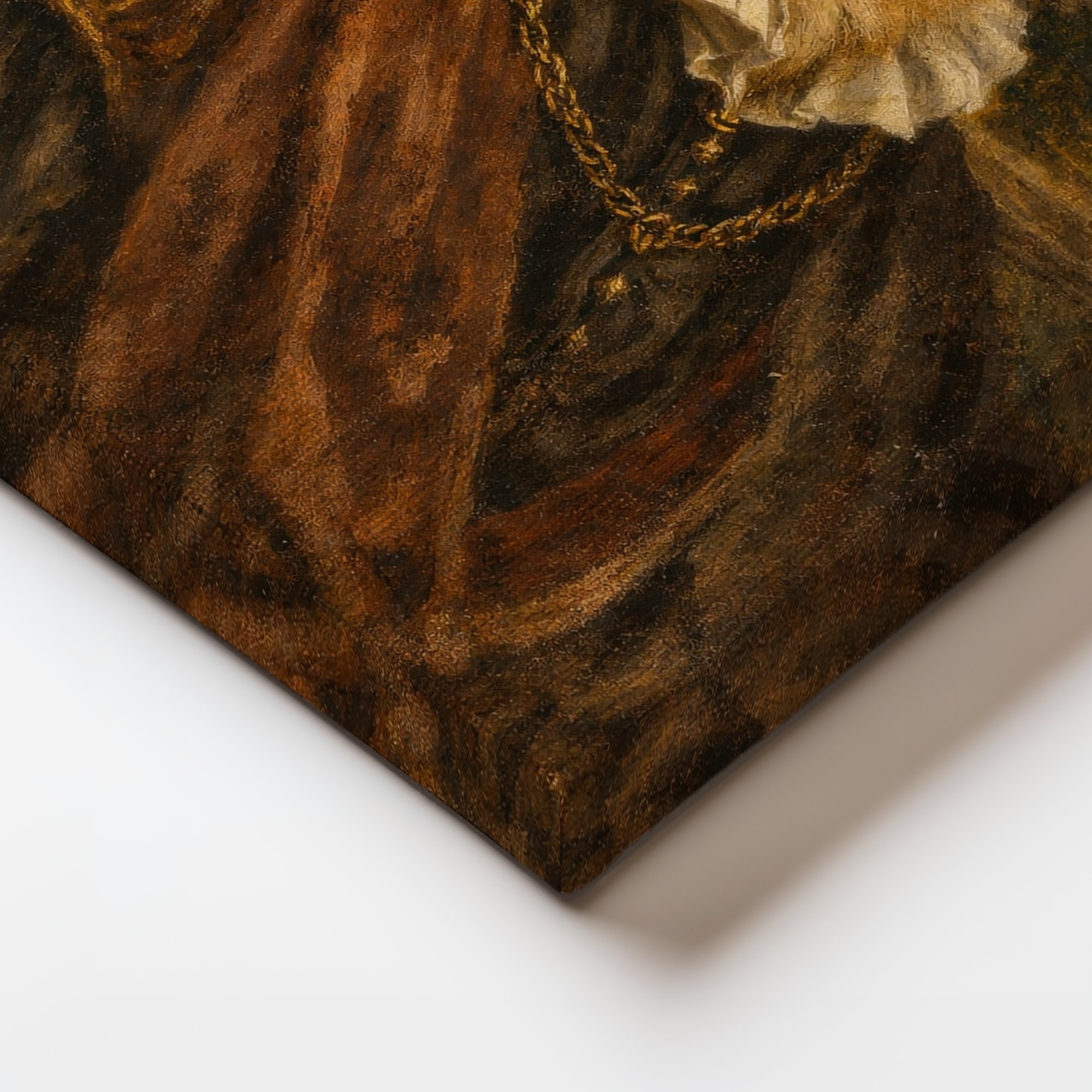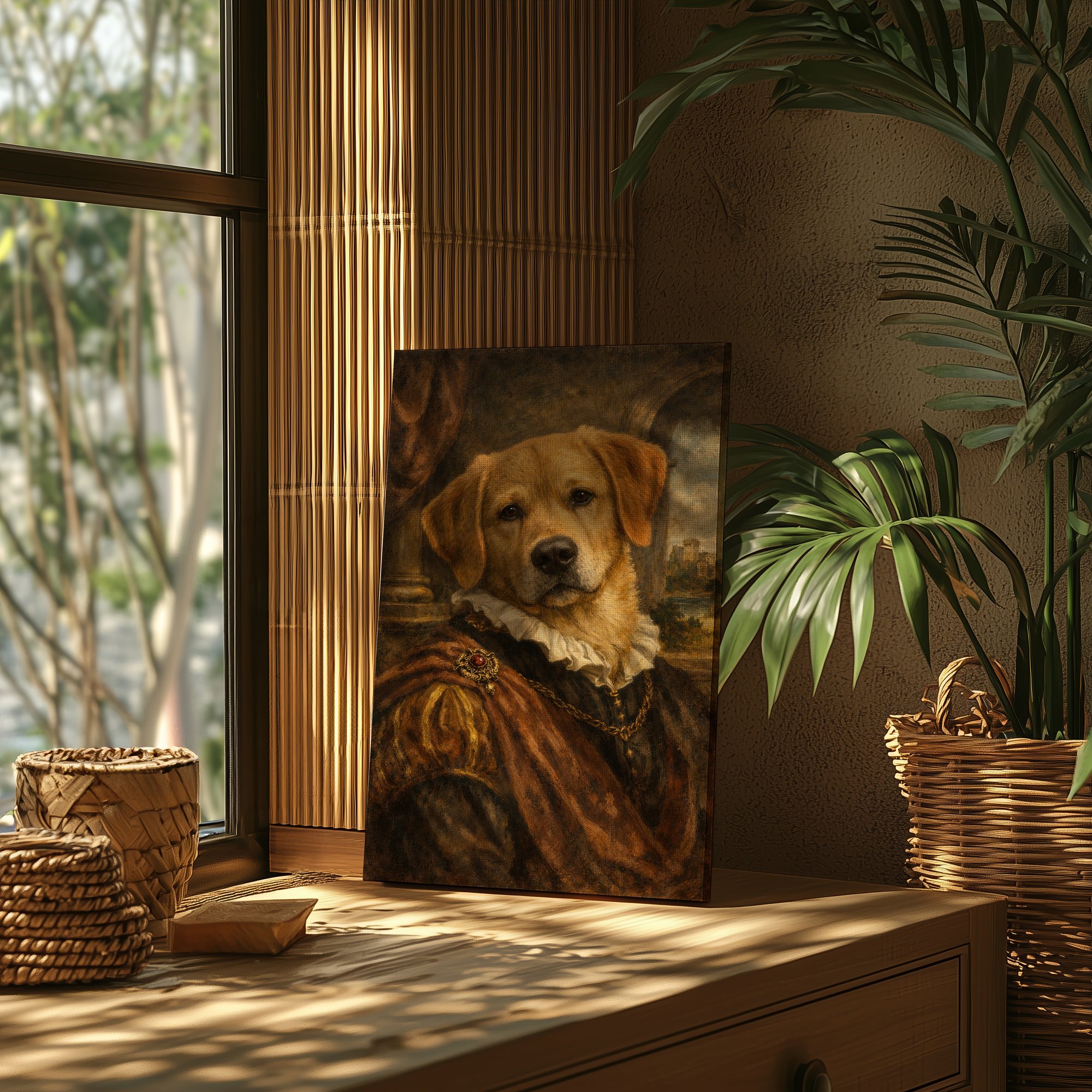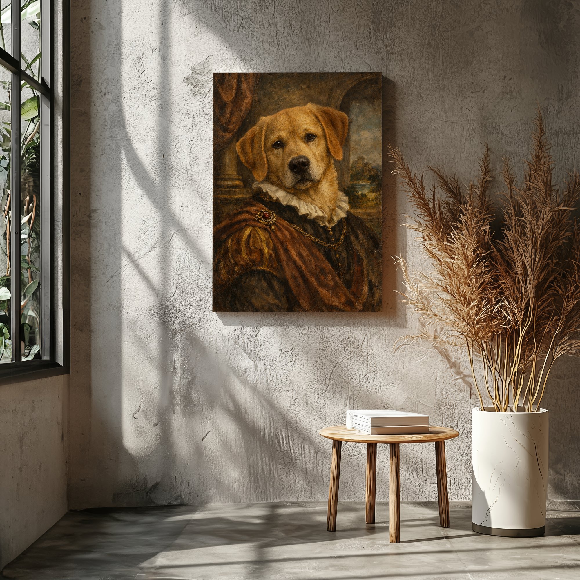 Creates a sense of grandeur, humour, and warmth all at once. The classical painting style elevates the playful subject — a piece that makes you smile every time you look at it.