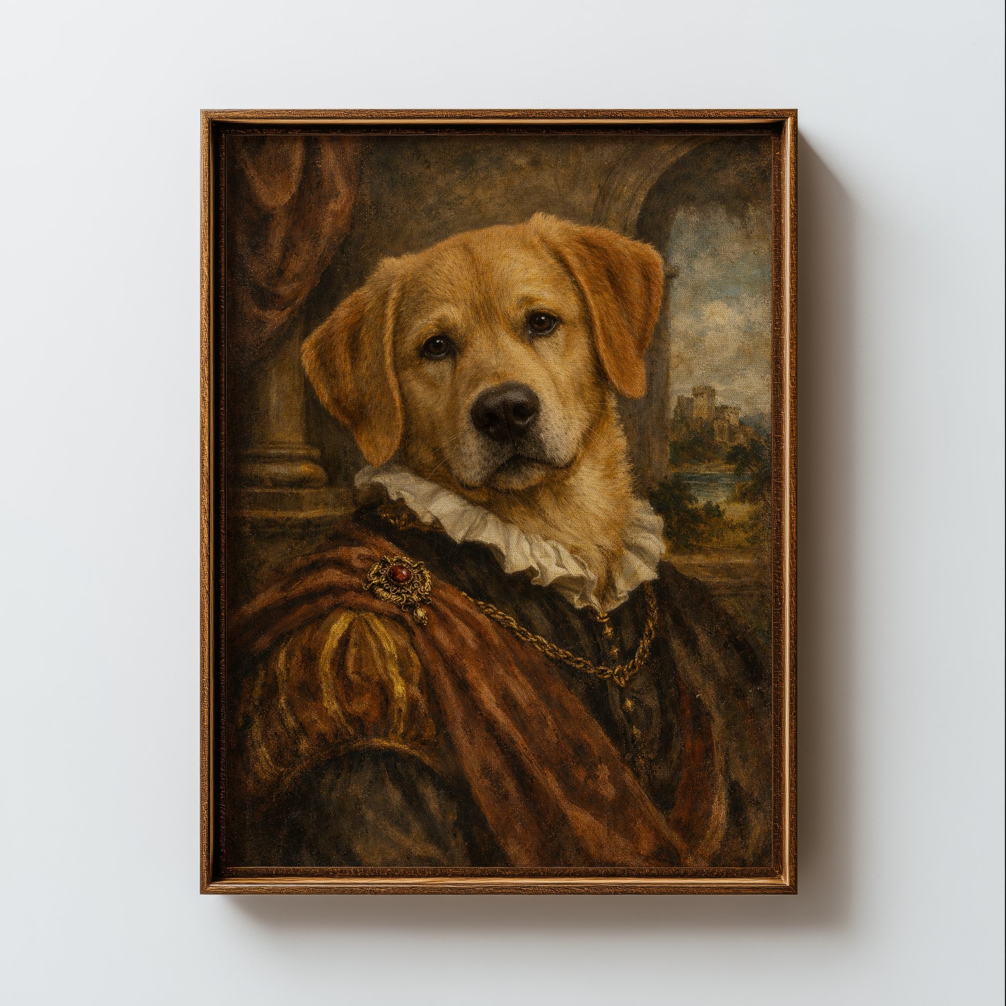 A golden retriever reimagined as Renaissance royalty — dressed in a rich amber robe with a ruffled collar and gold chain, set against a classical backdrop of draped curtains and distant castles. This majestic pet portrait blends old-master oil painting style with playful charm.